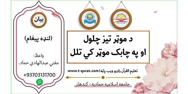 لنډ پیغام: واعظ: مفتي عبدالهادي حماد د همدې لنډ پیغام ویډیویي بڼه: https://youtu.be/uvBl9DbkwYY
