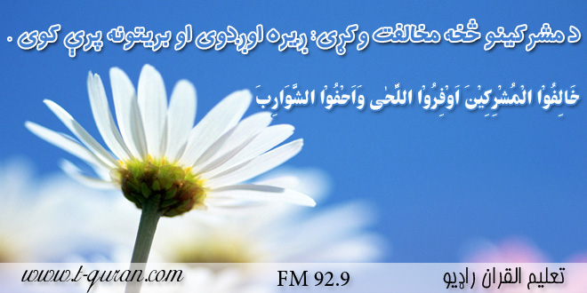 ترجمه : د مشركينو څخه مخالفت وكړى: ږيره اوږدوى او بريتونه پرې كوى . مشكوة ج ۲ صـ ۳۸۰.