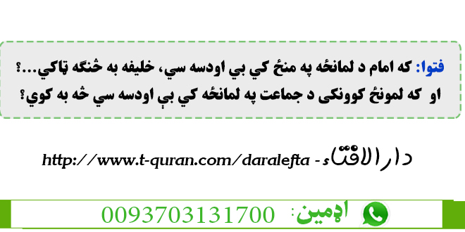 جواب ويونکی: مفتي عبدالهادي حماد د همدې فتوا ویډیو بڼه د تعلیم القرآن راډیو په یوټیوب چینل کي هم کتلای سی: https://youtu.be/8R-kFipPhx0