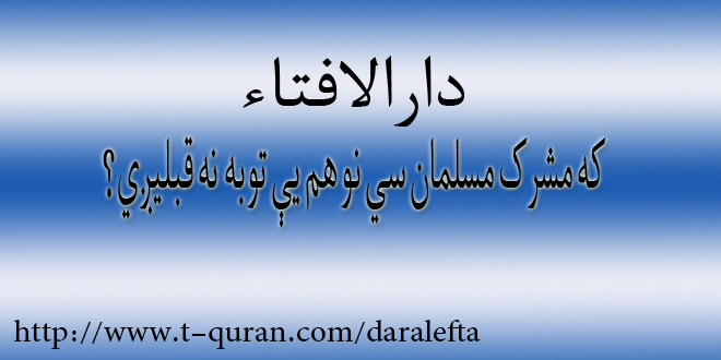 که مشرک مسلمان سي نو هم یې توبه نه قبلیږي؟ جولای 27, 2016 ایمان او عقائد, ستاسو شرعی پوښتنی او جوابونه 1,361 لیدنی کولای سی لاندي فتوا باندي راسته کلیک وکړئ او خپل کمپیوټر کښې يې ثبت کړئ شریکول Facebook Google +