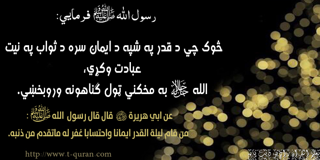 ژباړه: رسول الله صلی الله علیه وسلم  فرمايي څوک چي د قدر په شپه د ايمان سره د ثواب په نيت عبادت وکړي الله جل جلاله  به مخکني ټول ګناهونه وروبخښي.