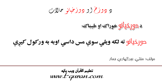 ژباړه : که دوى دتندي څخه فرياد وکړي ، ددوى فرياد به په داسي اوبو پوره کړل سي لکه ايشېدلي مس چي مخونه به بريانوي، ډېر بد اوبېدل دي او دوزخ ډېر بد ارام ځاى دئ.