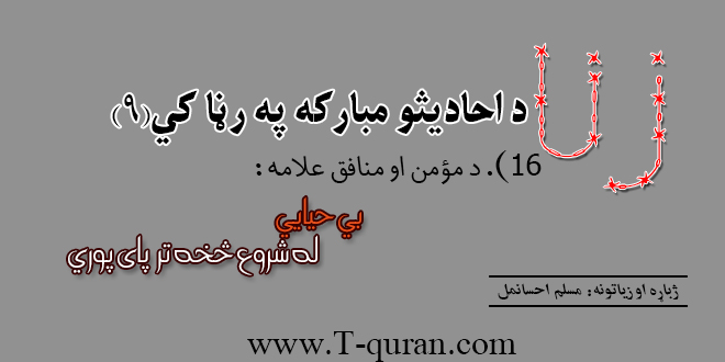 ژباړه: د مؤمن علامه داده چي الله تعالی د هغه حرص په لمانځه او روژه کي ایږدي او د منافق علامه داده چي الله تعالی د هغه حرص د هغه په نس (ګېډه) او فرج کي ایږدي.