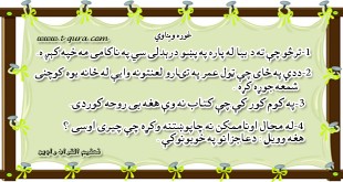 په څو کرښو کې لوی مفاهیم(۲۹) لیکوال: حامد افغان د تلاوت کوونکي مسلمان مثال رسول الله صلی الله علیه وسلم فرمایي: کوم مومن چې قران تلاوت کوي د هغه مثال د اترجه (یوډول لیمون) په څیر دی چې بوی یې هم خوږ ده او خوند یې هم ، او کوم …