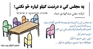 ۱: مجلس ته راتګ مخکي د نظافت رعايتول.۲: مجلس ته تر داخلېدو مخکي اجازه غوښتل او سلام ويل.۳: په مجلس کي تر کښیناستو وروسته لاندي کلمات ويل:بسم الله الرحمن الرحیم، الحمدلله والصلاة والسلام علي نبي الله.۴: ورين تندی لرل.۵: د هر چا جواب ته په نرمه لهجه جواب ويل.۶: پټي …