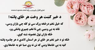 دخير کښت هر وخت هر ځاى پاشه!که خپل تخم درڅخه ورک سي نو کله چي باران وسي تاته به يې وښيي چي تا تخم چېيري پاشلى وو ځکه باران ټول تخمونه شنه کويځکه نو دخير تخم هرځاى تر هر اسمان لاندي دهر چاسره پاشه ګټه به يې خامخا وينې که …