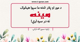 دمور او پلار درنښت دریښتني انسانیت برخه ده! دوهم درس: درسول الله صلی الله علیه وسلم څخه پوښتنه وسوه: دانسان کوم عمل الله جل جلاله ډېر خوښوي؟رسول الله صلی الله علیه وسلم په جواب کي وفرمایل: لمونځ په خپل وخت کي ادا کول.پوښتونکي وویل: بیا کوم عمل الله جل جلاله …
