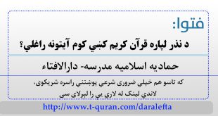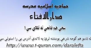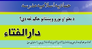 که غواړئ خپله شرعي پوښتنه د حماديې مدرسې دارالافتاء ته را واستوئ او د خپلې شرعي پوښتني جواب تر لاسه کړئ لاندي لینک کښېکاږئ دارالافتاء کولای سی لاندي فتوا باندي راسته کلیک وکړئ او خپل کمپیوټر کښې يې ثبت کړئ