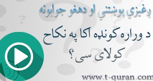 ږغیزي شرعي پوښتني او جوابونه: محمد سلام، له ۸ ناحیې څخه: پوښتنه: د وراره کونډه اکا ته په نکاح اخیستل جائز ده؟ که تاسو هم کومه شرعي پوښتنه لرئ کولای سئ د دارالافتاء له لاري یی راسره شریکې کړئ او یا هم کولای سئ دورځي په ۱۰:۰۰ بجو یی په …