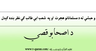 د حضرت صهيب (رض) اسلام حضرت صهيب(رض) د حضرت عمار(رض) سره يو ځاى اسلام راوړى ، رسول الله(ص)د حضرت ارقم(رض) په کور کي تشريف درلودئ چي دوى دوه هر يو جلا ــ جلا د رسول الله(ص) په خدمت کي حاضر سوه خو ناببره په دروازه کي سره يو ځاى …