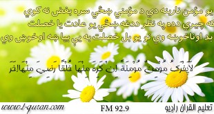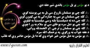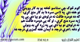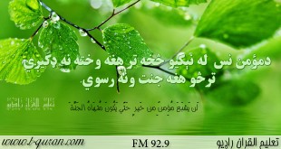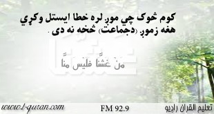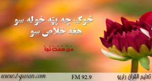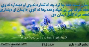 کامل ایمان نسته هغه چا لره چي… لَآ اِيمَانَ لِمَن لآ َّ اَمَانَةَ لَه ُ وَلاَ دِينَ لِمَن لا َّ عَهدَ لَه ُ (بيهقي ). ژباړه: ايمان نسته هغه چا لره چه امانتداره نه وي او دينداره نه وي هغه څوک چي پر خپله وعده وفا نه کوي، (دايمان او …