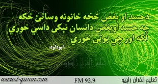 د حسد او بغض څخه ځانونه وساتئ: ِايَّاكُم وَالحَسَدَ يَأكُلُ الحَسَنَاتَ كَمَاتَأكُلُ النَّارُ الحَطَبَ (ابوداؤد). ژباړه: دحسد او بغض څخه ځانونه وساتئ ځکه چه حسد اوبغض دانسان نېکی داسی خوری لکه اور چی بوټی خوری.