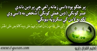 پر دیني احکامو صبر کونکی: رسول اکرم صلی الله علیه وسلم فرمایلي دي: يَأْتِى عَلَى النَّاسِ زَمَانٌ الصَّابِرُ فِيهِمْ عَلَى دِينِهِ كَالْقَابِضِ عَلَى الْجَمْرِ. رواه الترمذي پر خلکو یوه داسي زمانه راځي چي پر دین باندي صبر کونکی (دین عملي کونکی) شخص به داسي وي لکه په لاس کي سکروټه …