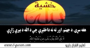 د الله جل جلاله د بیري ژړل: نبي اکرم صلی الله علیه وسلم فرمایلي دي: لاَ يَلِجُ النَّارَ رَجُلٌ بَكَى مِنْ خَشْيَةِ اللَّهِ. رواه الترمذي ژباړه: هغه سړی (د جهنم) اور ته نه داخلیږي چي د الله د بیري ژاړي (ځکه بیره د اطاعت کولو او د ګناه څخه د …