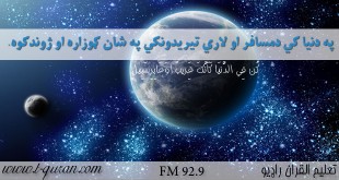 په دنیا کي د مسافر او لاري تیریدونکي ژوند! كُن فِي الدَّنيَا كَاَنَّكَ غَِريبٌ اوَعَابِِرِسَبِيلٍ (بخاری) . ژباړه: په دنيا کی دمسافر او لاری تيريدونکی په شان ګزاره او ژوندکوه.