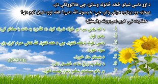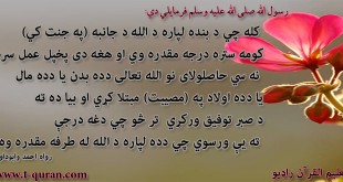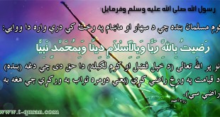 رسول الله صلی الله علیه وسلم وفرمایل: کوم مسلمان بنده چي د سهار او ماښام په وخت کي درې واره دا ووایي: رَضِيتُ بِاللَّهِ رَبًّا وَبِالْإِسْلَامِ دِينًا وَبِمُحَمَّدٍ نَبِيًّا نو پر الله تعالی (د خپل فضل او کرم لکبله) دا حق دی چي دغه (بنده) د قیامت په ورځ راضي …