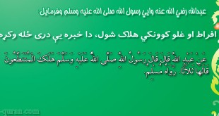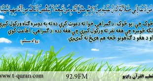 د ګمراهۍ خوا ته خلګ دعوتول (الحدیث) رسول اکرم صلی الله علیه وسلم فرمایلي دي: مَنْ دَعَا إِلَى ضَلاَلَةٍ كَانَ عَلَيْهِ مِنَ الإِثْمِ مِثْلُ آثَامِ مَنْ تَبِعَهُ لاَ يَنْقُصُ ذَلِكَ مِنْ آثَامِهِمْ شَيْئًا. رواه مسلم ژباړه: څوک چي (یو څوک) د ګمراهۍ خوا ته دعوت کړي ده ته به دومره …