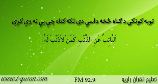 توبه ګناه محوه كوي عَنْ عَبْدِاللهِ بِنْ مَسْعُوْد قاَلَ : قَالَ رَسُوْلَ اللهِ (ص) اَلتَّائِبُ عَنِ الذَّنْبِ كَمَنْ لاَذَنْبَ لَهُ ترجمه: دحضرت عبدالله(رض) څخه روايت دى چي رسول الله(ص) وفرمايل: توبه كونكى د ګناه څخه داسي دى لكه ګناه چي يې نه وي كړې. مشكوة ج ۱ صـ ۲۰۶.
