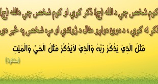 د ذكر او ذاكر فضائل قَالَ رَسُوْل اللهِ (ص) مَثَلُ الَّذِيْ يَذْكُرُ رَبَّهُ وَالَّذِيْ لاَيَذْكُرُ مَثَلُ الْحَيِّ وَالْمَيِّتِ ترجمه : نبي كريم (ص) فرمايې : كوم شخص چي د الله (ج) ذكر كوي او كوم شخص چي دالله (ج) ذكر نه كوي ، د دوئ دواړو مثال د ژوندي او …