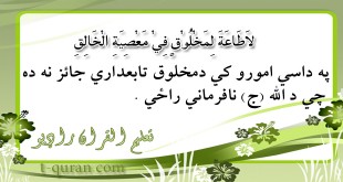 د خلګو په خاطر د الله (ج) نافرماني جائز نه ده لاَطَاعَةَ لِمَخْلُوْقٍ فِيْ مَعْصِيَةِ الْخَالِقِ ترجمه : په داسي امورو كي دمخلوق تابعداري جائز نه ده چي د الله (ج) نافرماني راځي . مرقات ج ۱ صــ ۴۳۱.