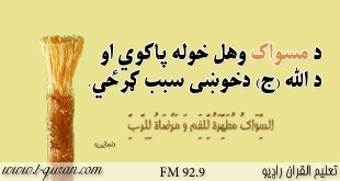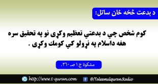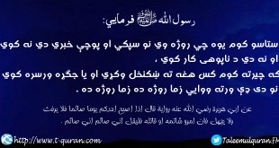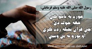 غوره په تاسو کي د قرآن زده کونکی اوښودونکى دئ(الحدیث) عن عثمان رضی الله عنه قال قال رسول الله صلی اله علیه وسلم خيرکم من تعلم القران و علمه)۱(. ژباړه : حضرت عثمان رضی الله عنه د رسول الله صلی الله علیه وسلم څخه روايت کوي، چي نبى صلی الله علیه وسلم …