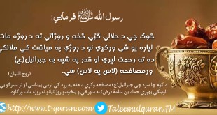 په حلال رزق د روژه مات ورکولو فضلیت(الحدیث) رسو الله صلی الله فرمایي: څوک چي د حلالي ګټي څخه و روژاتي ته د روژه مات لپاره يو شى ورکړي نو د روژې په مياشت کي ملائکي ده ته رحمت لېږي او قدر په شپه به جبرائيل علیه السلام ورمصافحه (لاس …