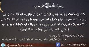 په روژه کې له سپکو خبرو پرهیز(الحدیث) رسول الله صلي الله علیه وسلم فرمايي : ستاسو کوم یوه چي روژه وي نو سپکي او پوچې خبري دي نه کوي او نه دي د ناپوهی کار کوي ، که چيرته کوم کس هغه ته ښکنځل وکړي او یا جګړه ورسره کوي …