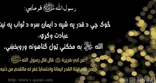 که چا دقدر په شپه کي عبادت وکړى ټول ګناهونه به يې وبخښل سي(الحدیث) ژباړه: رسول الله صلی الله علیه وسلم  فرمايي څوک چي د قدر په شپه د ايمان سره د ثواب په نيت عبادت وکړي الله جل جلاله  به مخکني ټول ګناهونه وروبخښي. عن ابي هريرة رضی الله …