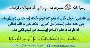 هغه ګناهونه چي خلګ يې سپک بولي (الحدیث)  رسول الله صلی الله علیه وسلم حضرت عایشې رضي الله عنها ته وفرمایل: يَا عَائِشَةَ! إِيَّاكِ وَمُحَقَّرَاتِ الذُّنُوبِ، فَإِنَّ لَهَا مِنَ اللَّهِ طَالِبًا. ژباړه: ای عایشې! خپل ځان د هغو ګناهونو څخه (په خاص ډول) وساته چي هغه حقیر (سپک او معمولي) …