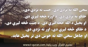 د سخي او بخیل حالت (الحدیث) رسول الله صلی الله علیه وسلم فرمايي: سخي الله ته نژدې دی، جنت ته نژدې دی، خلکو ته نژدې دی، د اوره څخه لیري دی. او بخیل د الله څخه لیري دی، د جنت څخه لیري دی، د خلکو څخه لیري دی، اور ته …