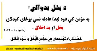 د بخل بد والى  : خَصْلَتَانِ لاَتَجْتَمِعَانِ فِيْ مُؤْمِنٍ اَلْبُخْلُ وَ سُوْءُ الْخُلْقِ([1] ترجمه : په مؤمن كي دوه (بد) عادته نسي يوځاى كيدلاى بخل او بد اخلاق . [1]   و عن ابي سعيد قال: قال رسول الله صلی الله علیه وسلم خصلتان…….. الخ . مشكوةج ۱ صـ ۱۶۵.