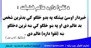 د تقوا داره عالم فضيلت : ( اَلاَ اِنَّ شَرَّ الشَّرِّ شِرَارُ الْعُلَمَاءِ وَ اِنَّ خَيْرَ الْخَيْرِ خِيَارُ الْعُلَمَاءِ ( ترجمه : خبردار اوسئ بيشكه په بدو خلګو كي بدترين شخص بد عالم دى او په ښو خلګو كي ښه ترين دخلګو ښه (تقوا داره) عالم دى . (مشکوة، کتاب …