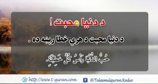 ( حُبُّ الدُّنْيَا رَاْسُ كُلِّ خَطِيْئَةٍ) [1] ترجمه : د دنيا محبت د هري خطا رېښه ده .  [1]   عن حذيفة قال سمعت رسول الله صلی الله علیه وسلم يقول في خطبة : الخمرجماع الاثم والنساء حبائل الشيطان وحب الدنيا …… الخ . مشكوة ج ۲ صـ ۴۴۴.