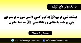 د عكسو دفع كول ) اَنَّ النَّبِيُّ ﷺ لَمْ يَكُنْ يَتْرُكُ فِيْ بَيْتِهِ شَيْئًا فِيْهِ تَصَالِيْبُ اِلاَّ نَقَضَهُ( [1] ترجمه : بيشكه نبي كريم ﷺ په كور كښې داسي شى نه پريښودى چي پر هغه به عكس وو بلكه نبي u به هغه ماتوى . [1]   عن عائشة رضي الله …