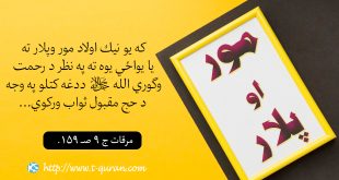 په يو حديث شريف كښې ذكر دي چي نبي كريم ﷺ فرمايې : كه يو نيك اولاد مور وپلار ته يا يواځي يوه ته په نظر د رحمت وګوري الله جل جلاله ددغه كتلو په وجه د حج مقبول ثواب وركوي ، صحابه كرامو وفرمايل چي كه يو شخص د …