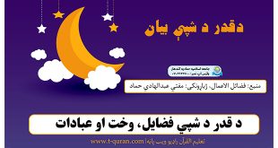 دقدر د شپې بيان د روژې په مياشت کي يوې شپي ته د قدر شپه ويل کېږي چي ډيره د خير او برکت شپه ده په قرآن کريم کي دا شپه تر زرو مياشتو غوره بلل سوې ده د زرو مياشتو څخه درواتيا کاله څلورمياشتي جوړيږي هغه سړى ډير نيکمرغه …