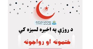 د روژې د ختمونو اړوند څو نکتې: لیکنه: مفتي عبدالهادي حماد |تعلیم القرآن اسلامي راډیو ویب پاڼه ۱: د روژې په وروستیو لسو شپو کي ختمونه شروع سي دغه ختمونه په دې معنا نه دي ، چي ختم وسو نور به نو تراويح نه کوي. بلکي دا صرف دقرانکريم دختم …