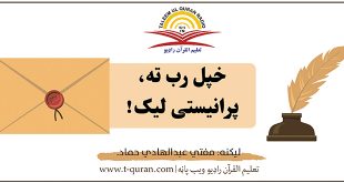 خپل رب ته پرانیستی لیک: لیکوال: مفتي عبدالهادي حماد | تعلیم القرآن اسلامي راډیو زه پوهېږم چي زما رب دنورو پاچاهانو په څېر لیک ته اړتیا نه لري چي دبندګانو دغوښتني لپاره یې طلب کړي، نه هم قاصد ته اړتیا لري چي دبنده عریضه ور ورسوې بلکي هغه علیم ذات …
