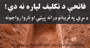 فاتحې د تکليف لپاره نه دي! لیکنه: مفتي عبدالهادي حماد | تعلیم القرآن اسلامي راډیو ویب پاڼه د فاتحې اړونده څو خبري د غور قابلي دي:۱: کله چي یو څوک وفات سي د مړي قريبانو ته تعزیت ورکول يعني د تسلیت لپاره ور تلل ثواب لري.۲: په مسجد کي فاتحه …