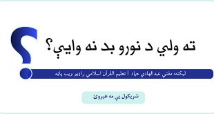 ته ولي د نورو بد نه وايي؟ لیکنه: مفتي عبدالهادي حماد | تعلیم القرآن اسلامي راډیو ویب پاڼه د ربيع بن هيثم څخه پوښتنه وسوه چي ته مو تر اوسه نه يې ليدلی چي د نورو عيب بيان کړې ، دا ولي؟ ده په جواب کي ورته وويل: زه تر …