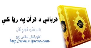 قرباني د قرآن په رڼا کې را لېږونکی: شاولي ځا ځی ۱- لَن يَنَالَ اللَّهَ لُحُومُهَا وَلَا دِمَآؤُهَا وَلٰكِن يَنَالُهُ التَّقْوٰى مِنكُمْ ۚ نه د هغو غوښي الله ته رسیږي او نه یې ويني، خو هغه ته ستاسي پرهېزګاري رسیږي. [سُوۡرَةُ الحَجّ : 37] ۲- وَالْبُدْنَ جَعَلْنٰهَا لَكُم مِّن شَعٰٓئِرِ …
