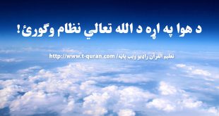 د هوا په اړه د الله تعالي نظام وګورئ (۱): هوا چلیږي هغه له آسمان څخه اوبه پورته کوي او وریځي ډکوي. (۲): یوه هوا وي چي هغه په ځمکه کي د پیدا کولو قوت زیاتوي. (۳): یوه هوا وي چي هغه وریځ له یو ځای څخه بل ځای ته …