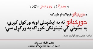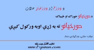 د دوزخیانو خوراک او څښان دوزخيانو ته به ايشېدلي اوبه ورکول کيږي الله(ج) فرمايي: وَسُقُوا مَاءً حَمِيمًا فَقَطَّعَ أَمْعَاءَهُمْ (15) ([1]) ژباړه : دوزخيان به په سختو ايشېدلو اوبو سره اوبه کړل سي نو کولمې به يې ددغه اوبو په وجهه پري سي. [1] : سورة محمد الاية ١٥ په …