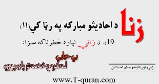 زنا د احادیثو مبارکه په رڼا کي(۱۰) ۱۸). د زاني لپاره ټول مصیبتونه قال رسول الله ﷺ: اماکم والزانی فانه زهاب البهاء وطول الفقر وقصاء العمر و أما اللوأتی فی الاخرة فسخط الله او سوءُ الحساب والخلود فی النار. [موصوعات ابن جوزی ؒ ۱۰۵-۱۰۸] ژباړه: نبي کریم ﷺ وفرمایل: ته …