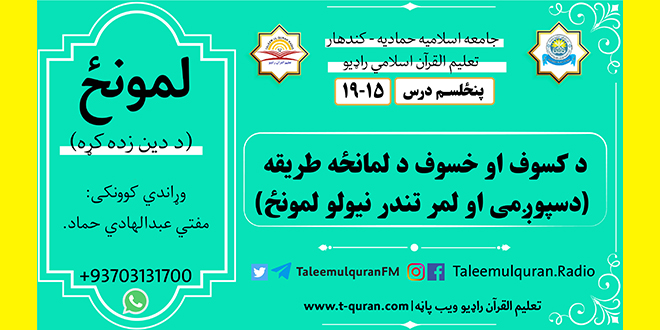 د دین زده کړه (لمونځ/ نماز) آتلسم درس: وړاندي کوونکی: مفتي عبدالهادي حماد د اتلسم درس ویډیویي بڼه د تعلیم القرآن راډیو په یوټیوب چینل هم کتلای سی: