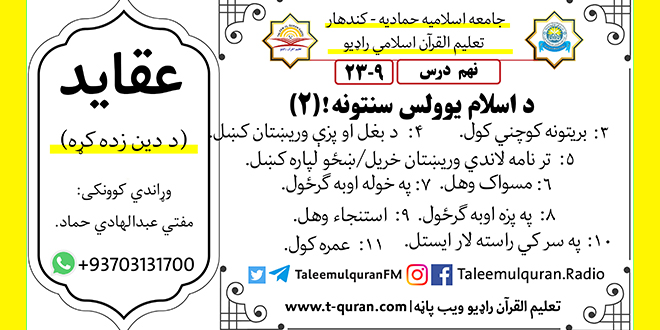 د دین زده کړې لړۍ(عقاید) نهم درس: وړاندي کوونکی: الحاج مفتي عبدالهادي حماد د نهم درس ویډیوي بڼه: