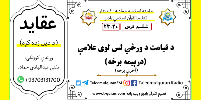 ستاسو دشرعي پوښتنو جوابونه ، کوم چي دمفتي عبدالهادي حماد صاحب لخوا (د خلاصون لار په خپرونه) کي جواب سوي که تاسوهم کومه شرعي پوښتنه لری د ورځي په (۱۰:۰۰) بجو يې په لاندي تلیفوني شمېره ثبت کولای سئ ۹۳۷۰۲۲۲۲۱۴۸+ ډانلوډ