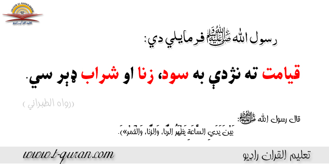 ترجمه: د حضرت ابن مسعود (رض) څخه روايت دئ، چي پيغمبرصلی الله علیه وسلم وفرمايل، چي: قيامت ته نژدې به سود، زنا او شراب ډېر سي.