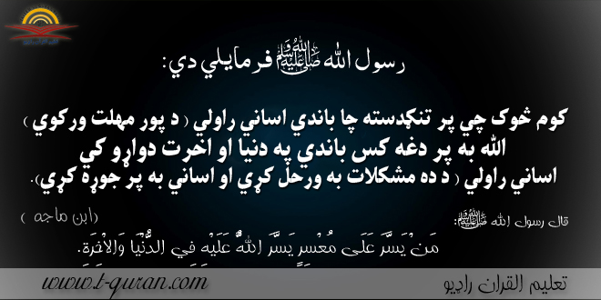 کوم څوک چي پر تنګدسته چا باندي اساني راولي (يعني د پور مهلت ورکوي او داسي نور) الله به پر دغه کس باندي په دنيا او آخرت دواړو کي اساني راولي (يعني د ده مشکلات به ورحل کړي او اساني به پر جوړه کړي).