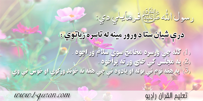 عثمان بن طلحه رضي الله تعالى عنه روايت كوي چي ماله  رسول الله صلى الله  عليه وسلم څخه واورېدل چي هغه فرمايل :  درې شيان ستا د ورور مينه له تاسره زياتوي :